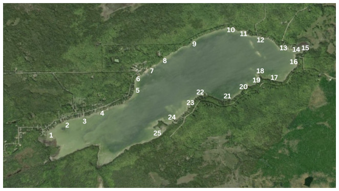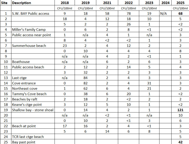 To check the 2025 E.coli levels at your property, find your location on the map below and refer to the chart provided. The chart also lists previous readings in your area.